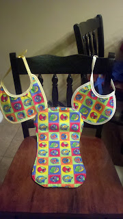 Sister #1 has opened her gift from me. Therefore I can now post the pics. I made 2 burp cloths and a bunch of Bibs for her. This is the first set that I made for her. The set I'm calling the busy bee set. as a bonus to the set is the busy bee puppy bib. All of these I found patterns for from other sights. However, they didn't print out right. For most the bibs I used velcro for the closure. A thought while using velcro for baby stuff: always put the softer side of the velcro on the portion that has the possibility of touching the baby's skin. This lessens the risk of irritation. This piece of advice was given to me by my husband. I have not figured out how to make things water proof yet so these are just cloth. I got all the fabric from Wal~mart. It's just their regular cotton fabric. The burp cloth has a sheet of batting in the middle to make it a little more comfy for baby and mommy. Apparently these were the only two pictures I got before shipping off the items. I also had a bib with the whole front bees, and the back was black. The burp cloth was bee's on the front, black on the back. I'll be better about pictures as I keep sewing. I found with this set that I need a lot of work with sewing in circles. Also, I resized everything. The patterns printed out a tiny bit small so I used them as a basis with which to work. I upsized the bibs and added a few inches for the burp cloth. The puppy however was done exactly to the bib pattern. again....need to work on circles.